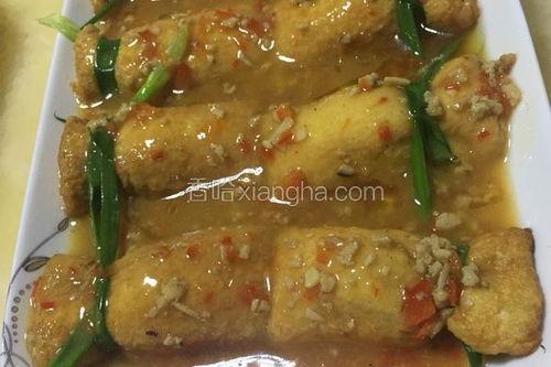 6. 卷豆腐:将炸好的豆腐块放在案板上,铺上馅料,卷成圆柱形。