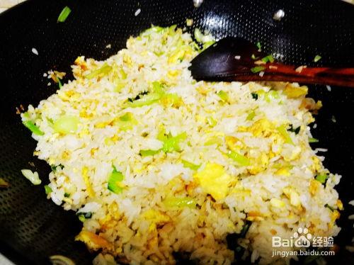 4. 出锅:炒至米饭粒粒分明,蛋块均匀分布在米饭中,即可出锅。